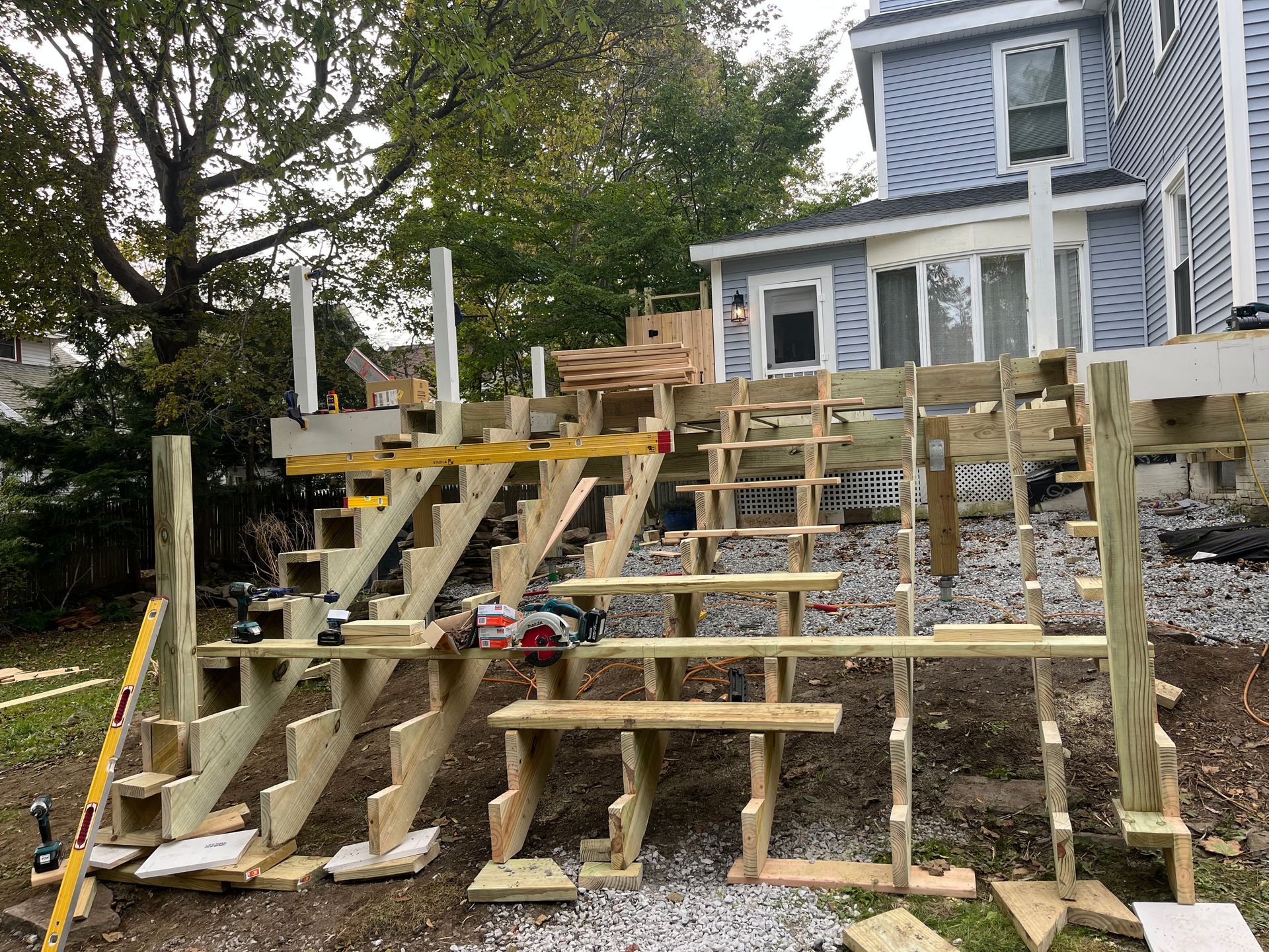 Framing, decking boards, railings, and stairs are installed.